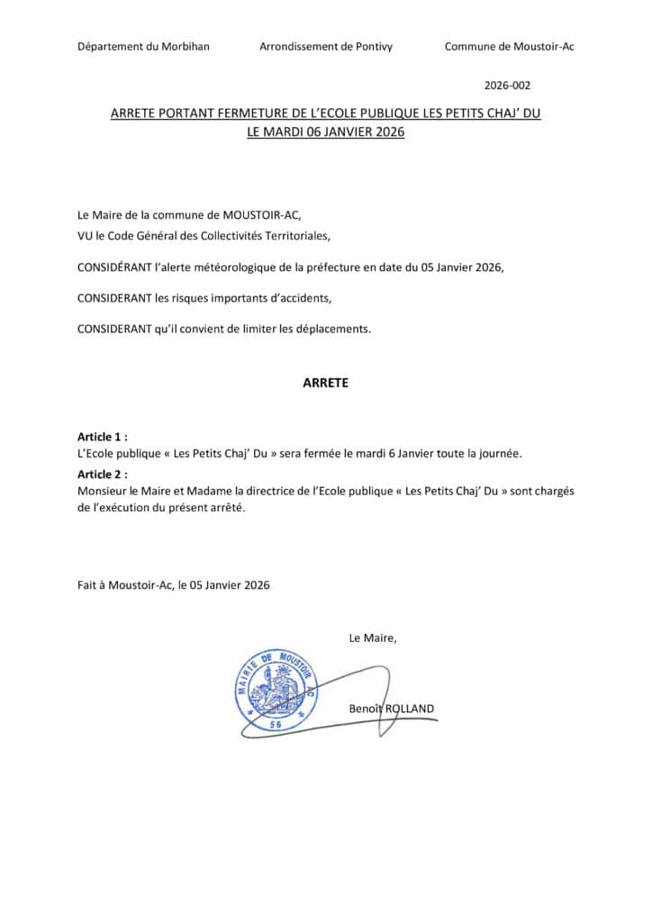 En concertation avec la Directrice de l’école publique Les Petits Chaj-Du, l’École publique sera fermée demain 6 janvier 2026 conformément à l’arrêté municipal ci-joint.